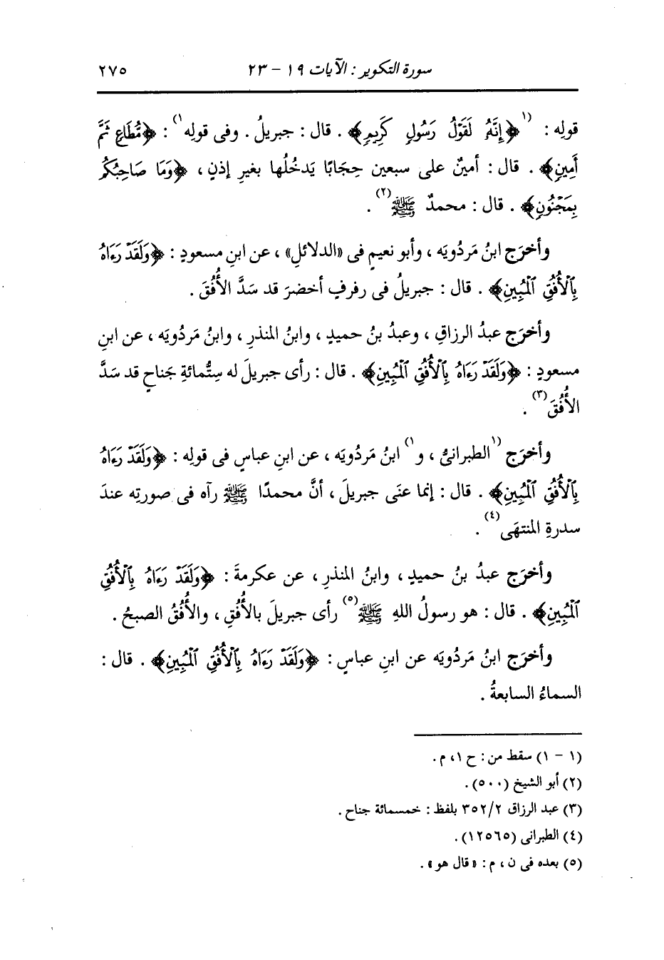 قوله : !(إنه لقول رسول كريم). قال: جبريل وفي قوله: {مطاع ثم أمين} قال : أمين على سبعين حجابا يدخلها بغير إذن {وما صاحبكم بمجنون} قال : محمد صلى الله عليه وسلم وفي قوله : {ولقد رآه بالأفق المبين} قال : كنا نحدث أنه الأفق الذي يجيء منه النهار وفي لفظ : إن الأفق من حيث تطلع الشمس.