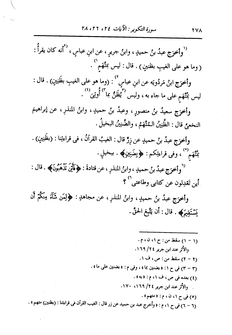 وأخرج عَبد بن حُمَيد عن زر قال : الغيب القرآن في قراءتنا بظنين متهم وفي قراءتكم {بضنين} ببخيل.