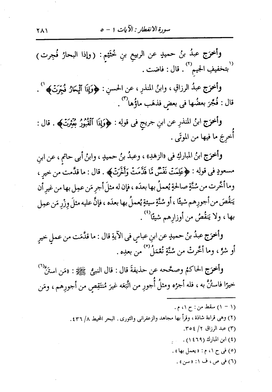 وأخرج عَبد بن حُمَيد عن الربيع بن خيثم {وإذا البحار فجرت} قال : فجر بعضها في بعض فذهب ماؤها.