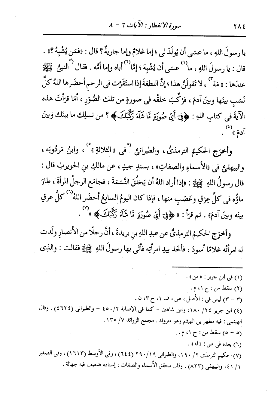 وأخرج الحكيم الترمذي والطبراني ، وَابن مردويه بسند جيد والبيهقي في الأسماء والصفات عن مالك بن الحويرث قال : قال رسول الله صلى الله عليه وسلم : إذا أراد الله أن يخلق النسمة فجامع الرجل المرأة طار ماؤه في كل عرق وعصب منها فإذا كان اليوم السابع أحضر الله كل عرق بينه وبين آدم ثم قرأ {في أي صورة ما شاء ركبك}.