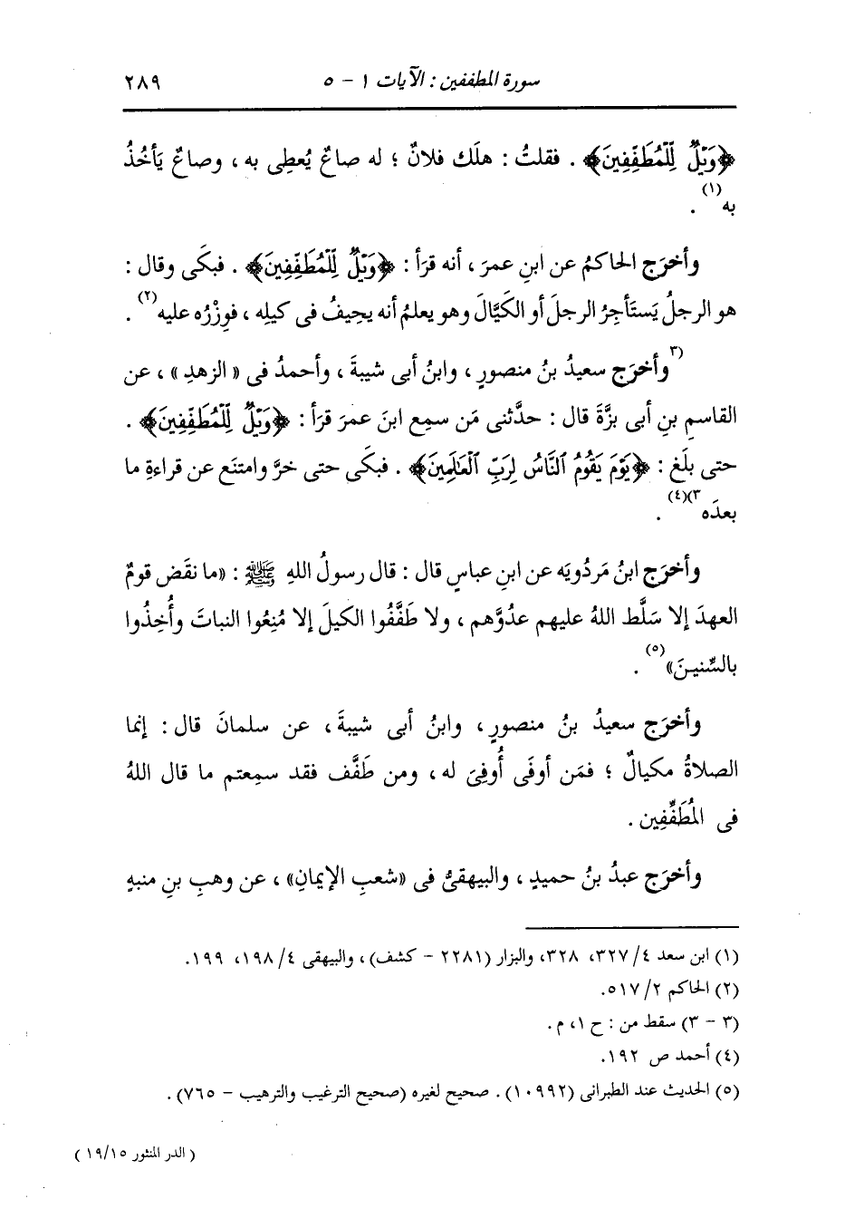 وأخرج الحاكم عن ابن عمر أنه قرأ {ويل للمطففين} فبكى وقال : هو الرجل يستأجر الرجل أو الكيال وهو يعلم أنه يخيف في كيله فوزره عليه.