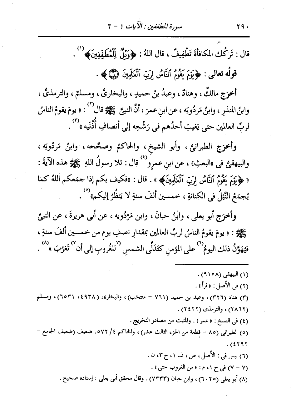 أخرج مالك وهناد ، وعَبد بن حُمَيد والبخاري ومسلم والترمذي ، وَابن المنذر ، وَابن مردويه عن ابن عمر أن النَّبِيّ صلى الله عليه وسلم قال : {يوم يقوم الناس لرب العالمين} حتى يغيب أحدهم في رشحه إلى أنصاف أذنيه.