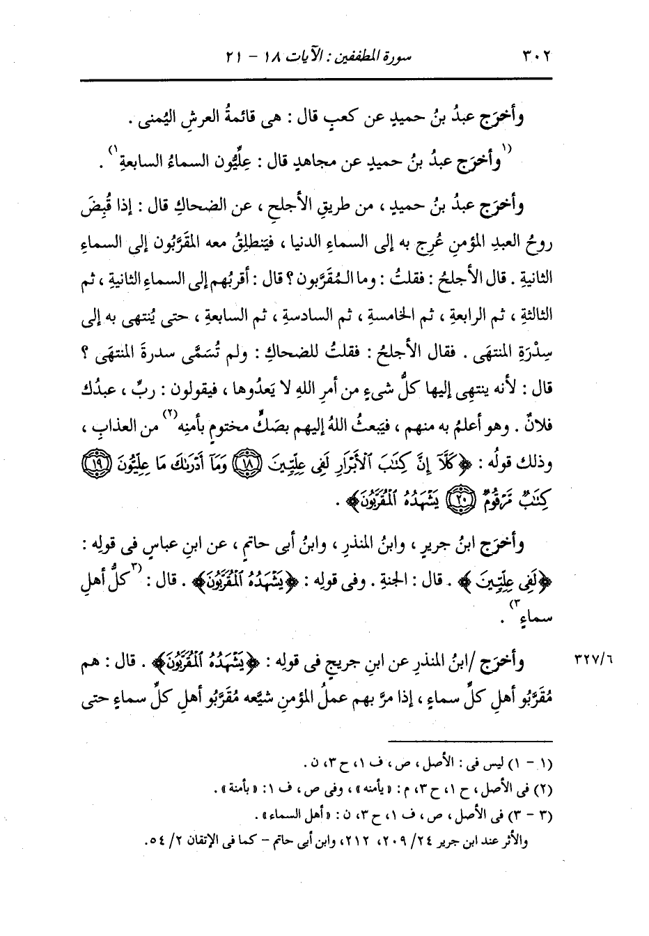 وأخرج ابن جرير ، وَابن أبي حاتم ، وَابن المنذر عن ابن عباس في قوله : {لفي عليين} قال : الجنة وفي قوله : {يشهده المقربون} قال : كل أهل سماء.