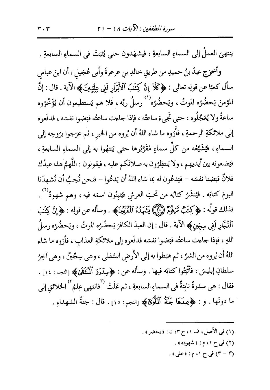 وأخرج عَبد بن حُمَيد من طريق خالد بن عرعرة وأبي عجيل أن ابن عباس سأل كعبا عن قوله تعالى : {كلا إن كتاب الأبرار لفي عليين} الآية قال : إن المؤمن يحضره الموت ويحضره رسل ربه فلا هم يستطيعون أن يؤخروه ساعة ولا يعجلوه