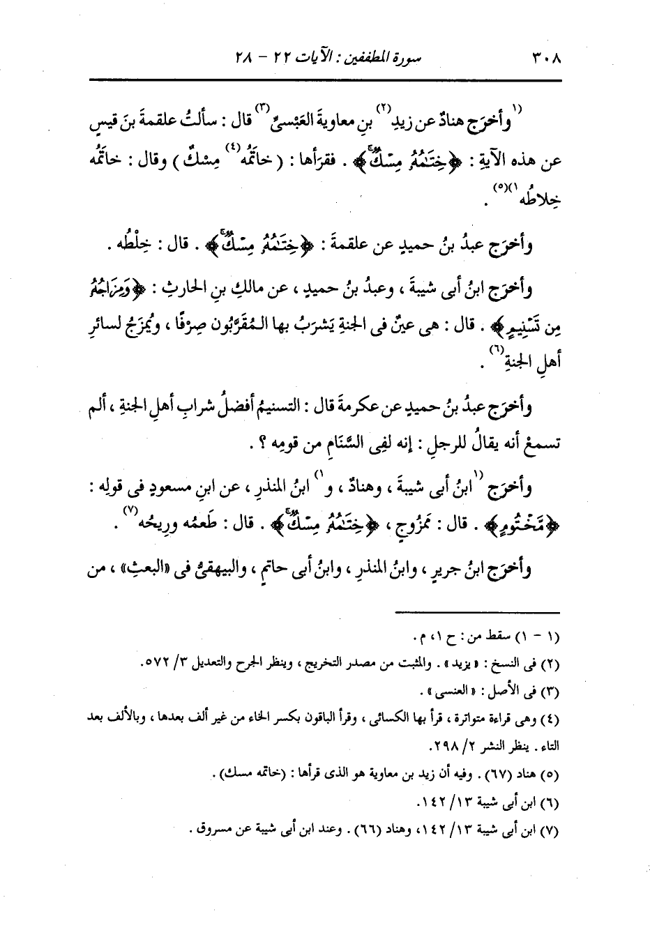 وأخرج سعيد بن منصور وهناد ، وَابن أبي حاتم ، وَابن أبي شيبة ، وَابن المنذر والبيهقي في البعث عن ابن مسعود في قوله : {يسقون من رحيق مختوم} قال : الرحيق الخمر والمختوم يجدون عاقبتها طعم المسك.