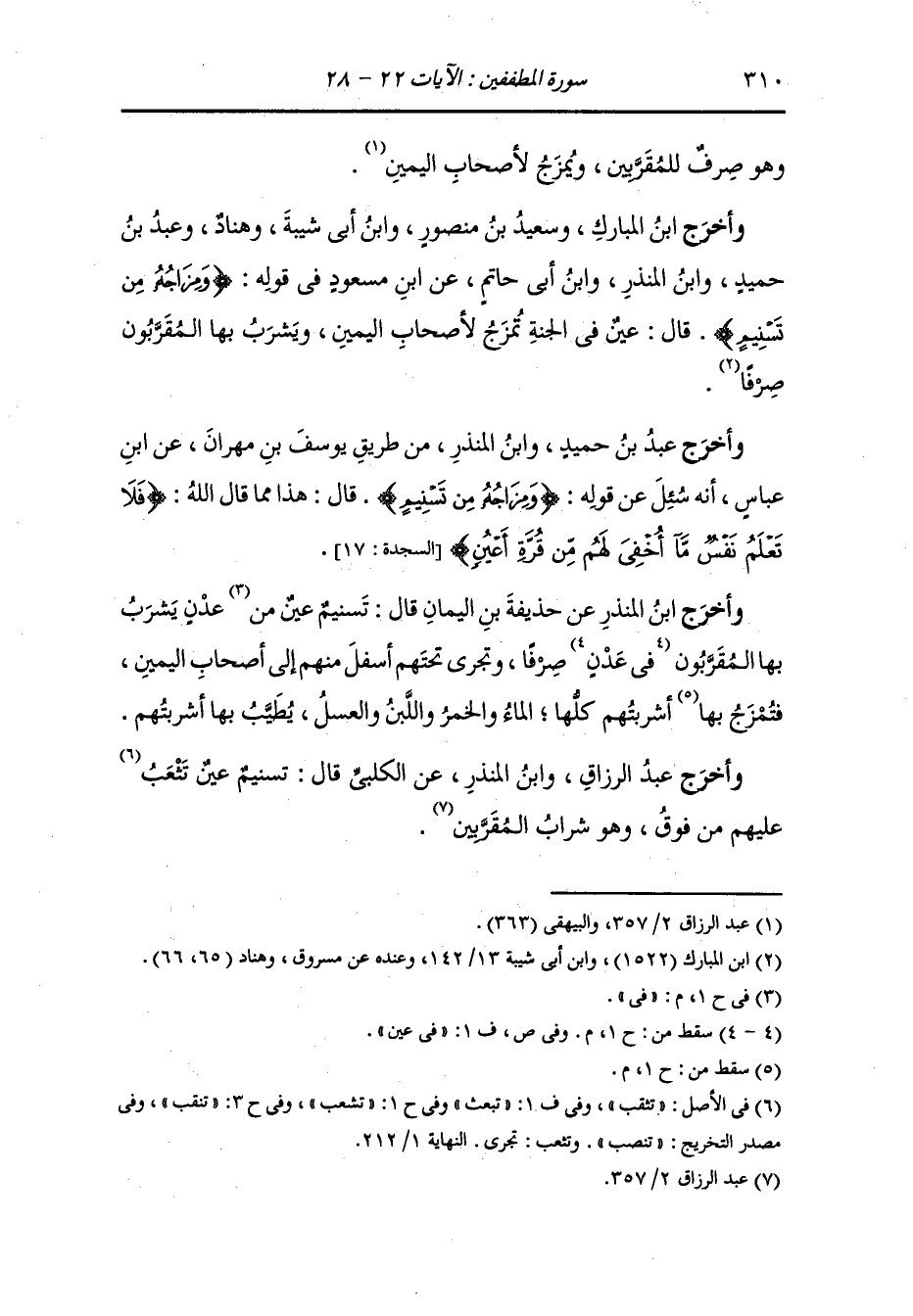 وأخرج ابن أبي شيبة ، وَابن المبارك وسعيد بن منصور وهناد ، وعَبد بن حُمَيد ، وَابن المنذر ، وَابن أبي حاتم عن ابن مسعود في قوله : {ومزاجه من تسنيم} قال : عين في الجنة تمزج لأصحاب اليمين ويشرب بها المقربون صرفا.