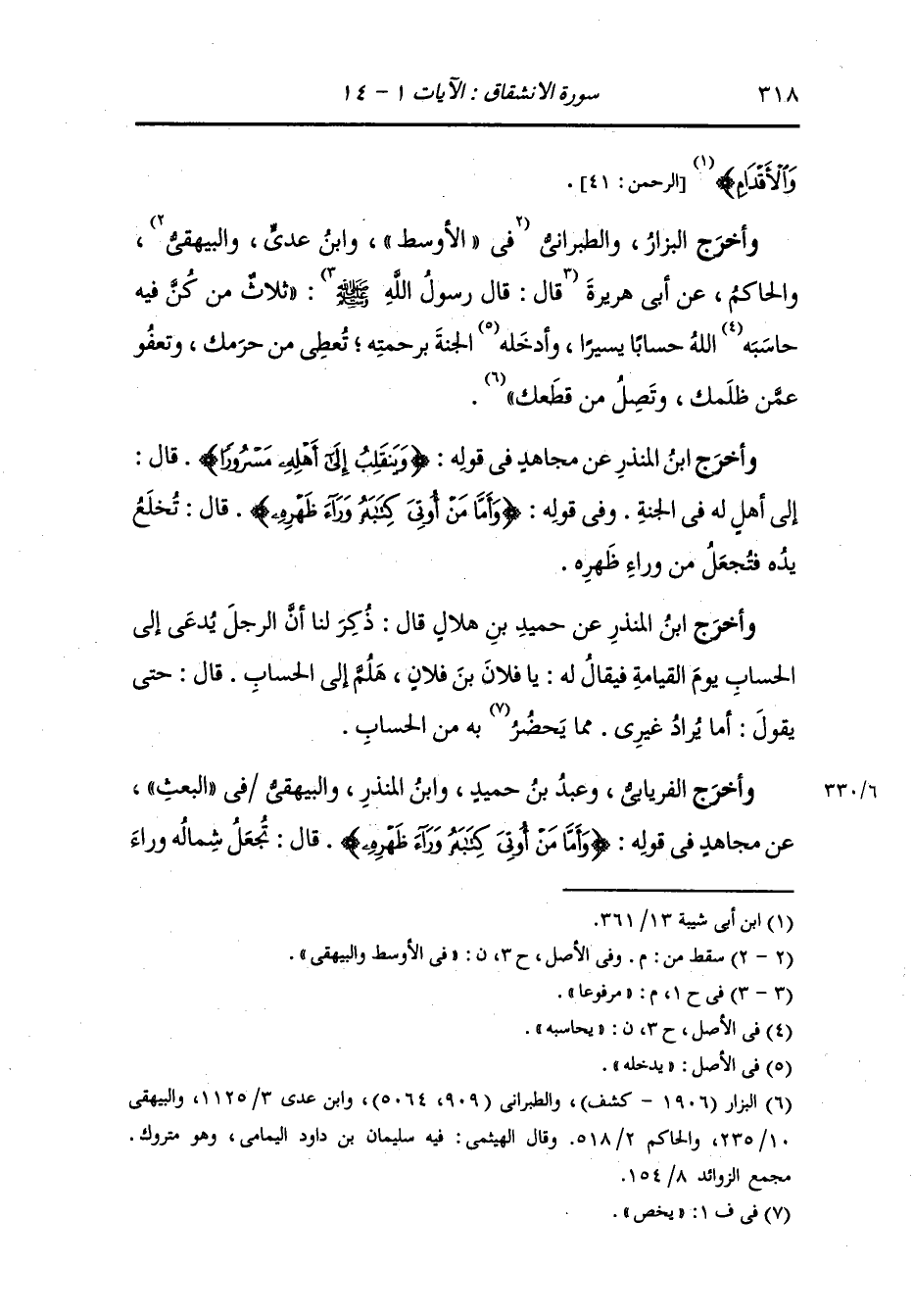 وَأخرَج الفريابي ، وعَبد بن حُمَيد ، وَابن المنذر والبيهقي في "البعث" عن مجاهد في قوله : (وأما من أتي كتابه وراء ظهره). قال : نجعل شماله وراء