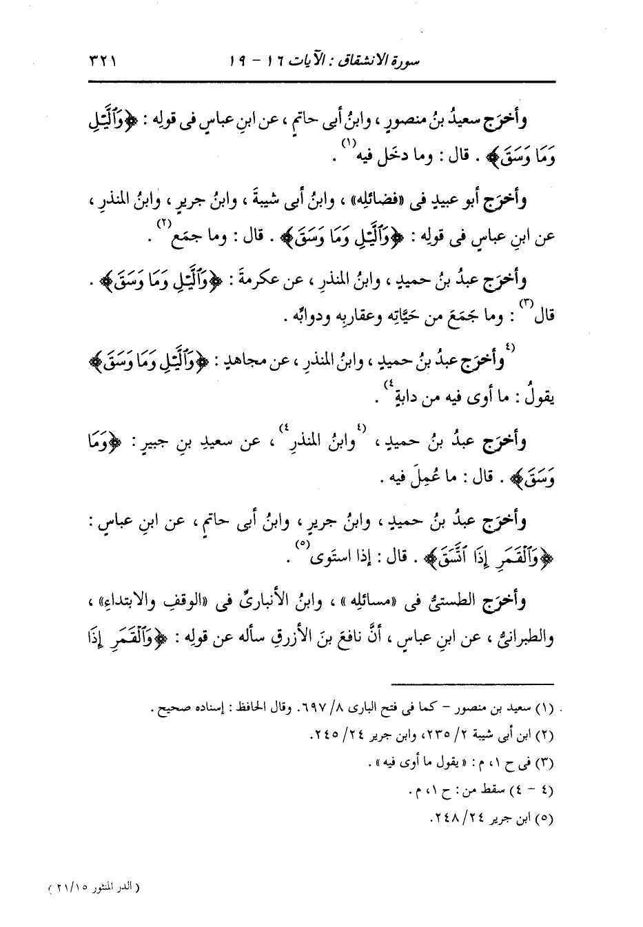 وأخرج أبوعبيد في فضائله ، وَابن أبي شيبة ، وَابن جَرِير ، وَابن المنذر عن ابن عباس في قوله : {والليل وما وسق} قال : وما جمع.