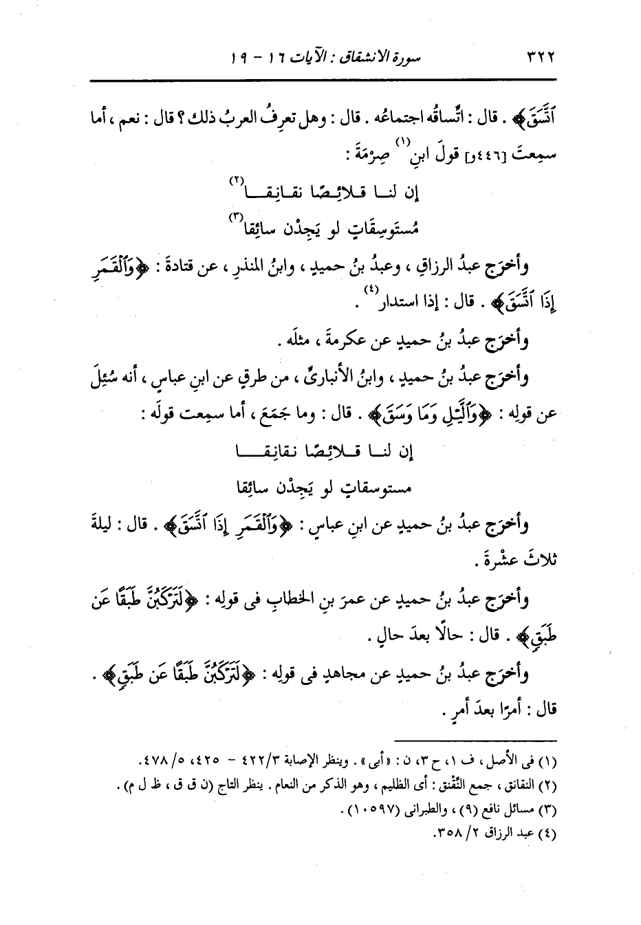 وَأخرَج عبد الرزاق ، وعَبد بن حُمَيد ، وَابن المنذر عن قتادة {والقمر إذا اتسق} قال : إذا استدار.
