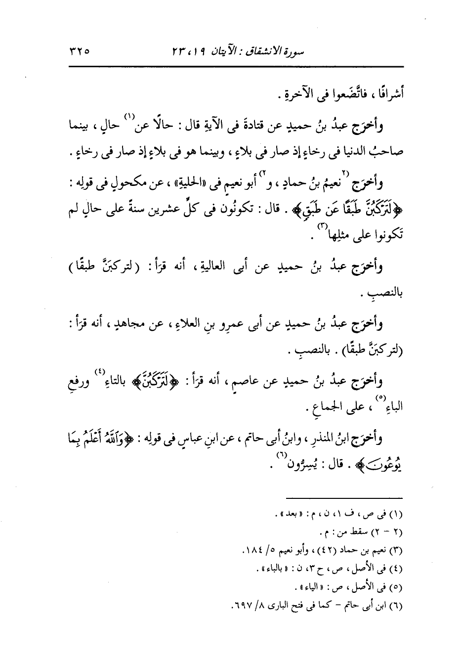 وأخرج عَبد بن حُمَيد عن أبي عمرو بن العلاء عن مجاهد أنه قرأ {لتركبن طبقا} بالنصب.