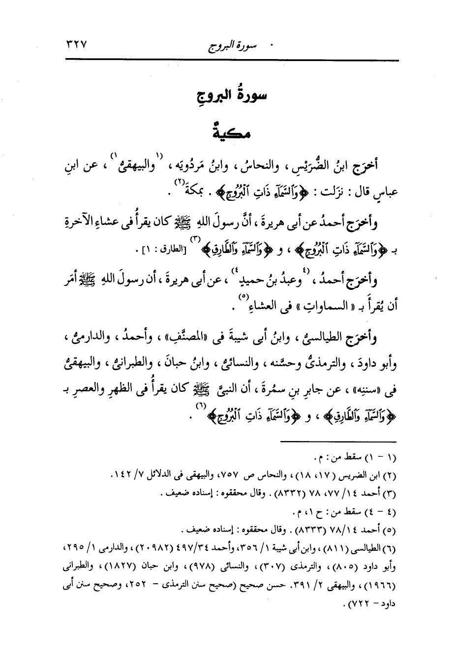 أَخْرَج ابن الضريس والنحاس ، وَابن مردويه عن ابن عباس قال : نزلت {والسماء ذات البروج} بمكة.