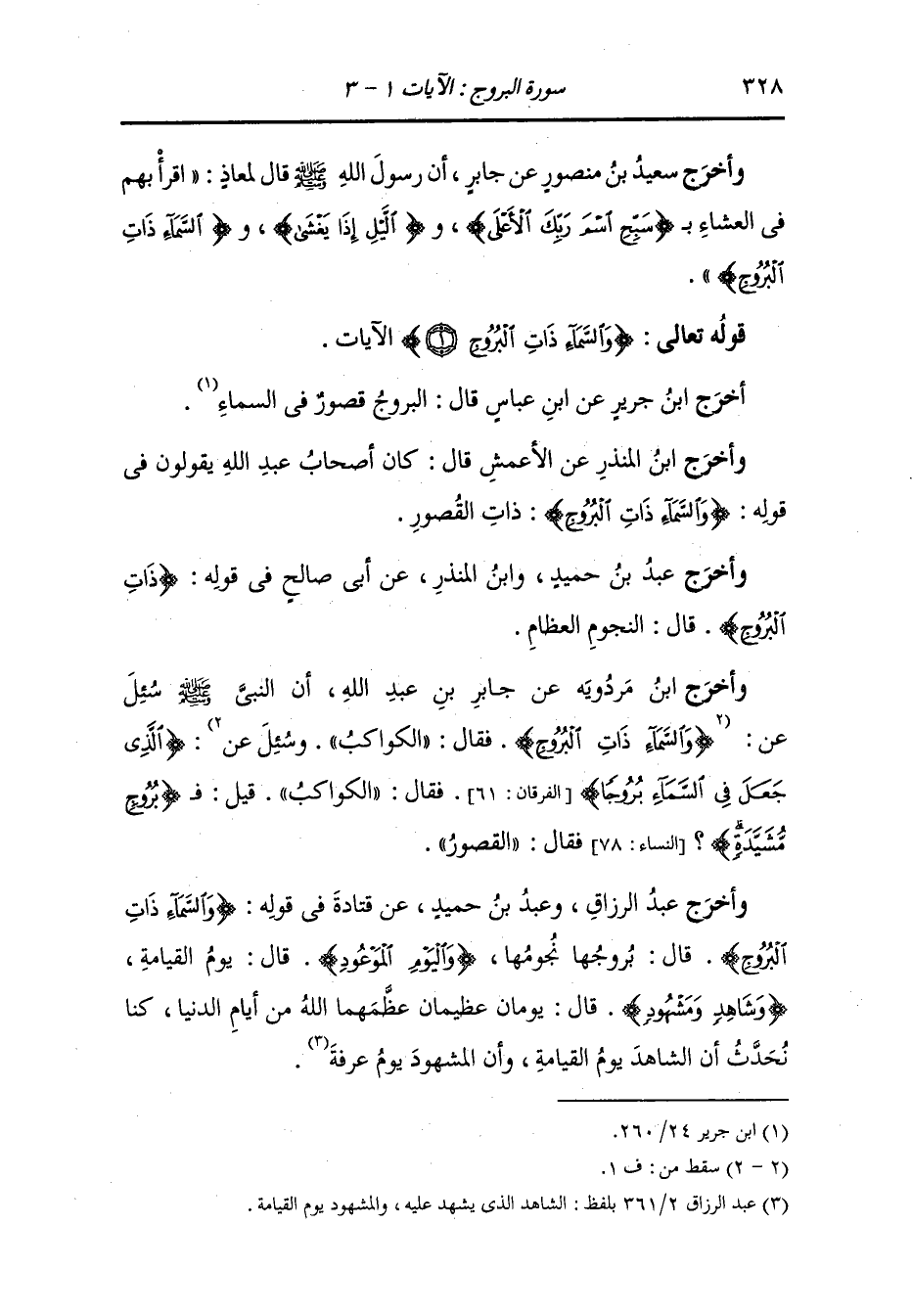 وأخرج عبد الرزاق ، وعَبد بن حُمَيد عن قتادة في قوله : {والسماء ذات البروج} قال : بروجها نجومها {واليوم الموعود} قال : يوم القيامة {وشاهد ومشهود} قال : يومان عظيمان عظمهما الله من أيام الدنيا كنا نحدث أن الشاهد يوم القيامة والمشهود يوم عرفة.