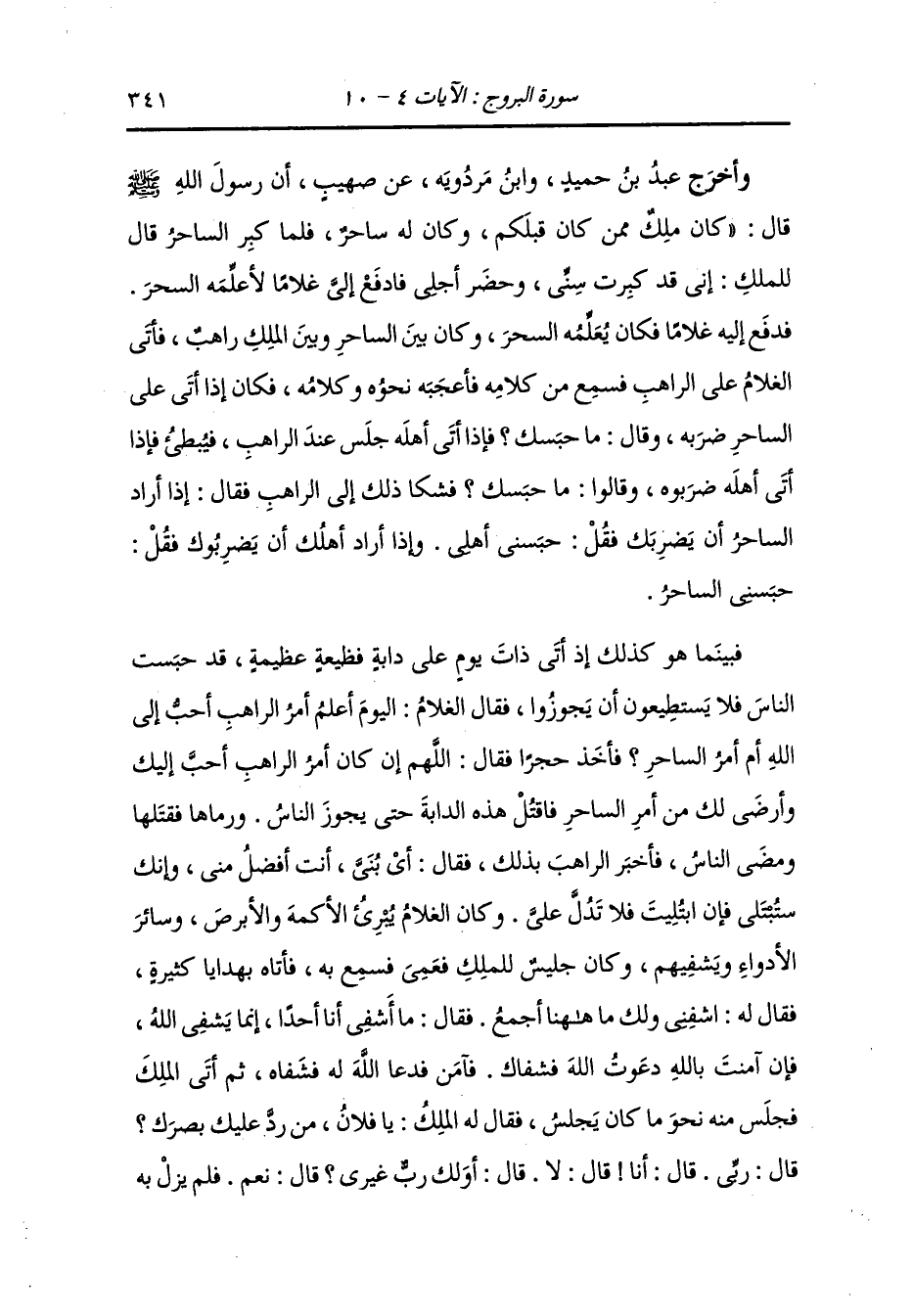 وأخرج عَبد بن حُمَيد ، وَابن مردويه عن صهيب أن رسول الله صلى الله عليه وسلم قال : كان ملك ممن كان قبلكم وكان له ساحر فلما كبر الساحر قال للملك : إني قد كبرت سني وحضر أجلي فادفع إلي غلاما أعلمه السحر ، فدفع إليه غلاما فكان يعلمه السحر ، وكان بين الساحر وبين الملك راهب فأتى الغلام على الراهب فسمع من كلامه فأعجبه نحوه وكلامه فكان إذا أتى على الساحر ضربه وقال : ماحبسك فإذا أتى أهله جلس عند الراهب فيبطئ فإذا أتى أهله ضربوه وقالوا : ماحبسك فشكا ذلك إلى الراهب فقال : إذا أراد الساحر أن يضربك فقل : حبسني أهلي وإذا أراد أهلك أن يضربوك فقل : حبسني الساحر ، فبينما هو كذلك إذ أتى ذات يوم على دابة فظيعة عظيمة قد حبست الناس فلا يستطيعون أن يجوزوا فقال الغلام : اليوم أعلم أمر الراهب أحب إلى الله أم أمر الساحر ، فأخذ حجرا فقال : اللهم إن كان أمر الراهب أحب إليك وأرضى لك من أمر الساحر فاقتل هذه الدابة حتى يجوز الناس ، فرماها فقتلها ومضى الناس فأخبر الراهب بذلك فقال : أي بني أنت أفضل مني وإنك ستبتلى فإن ابتليت فلا تدل علي ، وكان الغلام يبرئ الأكمه والأبرص وسائر الأدواء ويشفيهم وكان جليس الملك قد عمي فسمع به فأتاه بهدايا كثيرة فقال له : اشفني ولك ما ههنا أجمع فقال : ما أشفي أنا أحدا إنما يشفي الله فإن آمنت بالله دعوت الله فشفاك فآمن فدعا له فشفاه ، ثم أتى الملك فجلس منه نحو ما كان يجلس فقال له الملك : يا فلان من رد عليك بصرك قال : ربي قال : أنا ، قال : لا ، قال : أولك رب غيري قال : نعم ، فلم يزل به