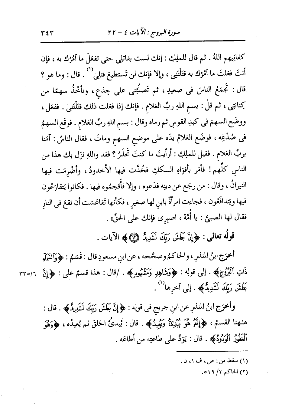أخرج ابن المنذر والحاكم وصححه عن ابن مسعود قال : قسم {والسماء ذات البروج} إلى قوله : {وشاهد ومشهود} قال : هذا قسم على أن بطش ربك لشديد إلى آخرها.