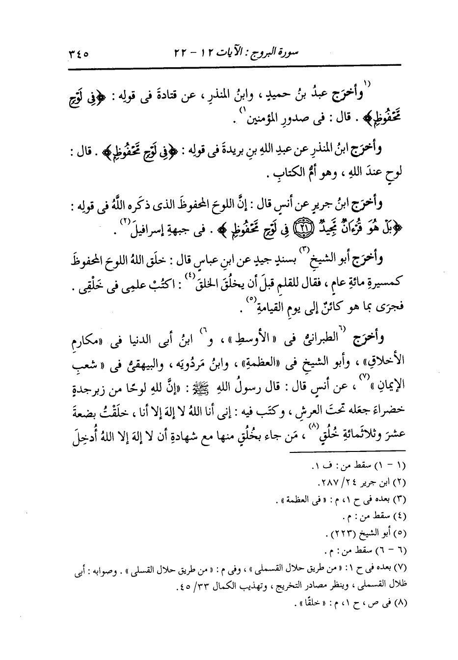 وأخرج ابن المنذر عن عبد الله بن بريدة {في لوح محفوظ} قال : لوح عند الله وهو أم الكتاب.