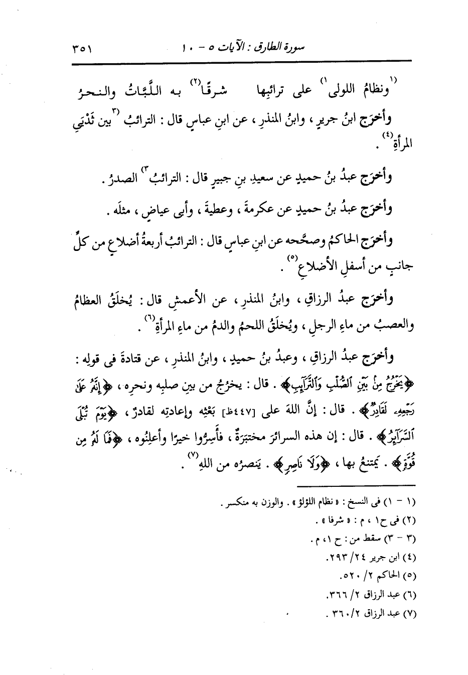 وأخرج عبد الرزاق ، وعَبد بن حُمَيد ، وَابن المنذر عن قتادة في قوله : {يخرج من بين الصلب والترائب} قال : يخرج من بين صلبه نحره {إنه على رجعه لقادر} قال : إن الله على بعثه وإعادته لقادر {يوم تبلى السرائر} قال : إن هذه السرائر