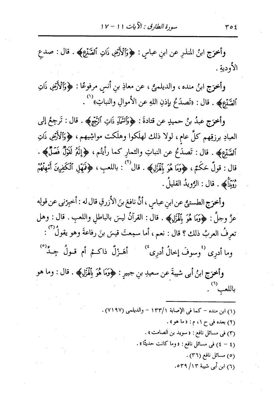 وأخرج عَبد بن حُمَيد عن قتادة {والسماء ذات الرجع} قال : ترجع إلى العباد برزقهم كل عام لولا ذلك لهلكوا وهلكت مواشيهم {والأرض ذات الصدع} قال : تصدع عن النبات والثمار كما رأيتم {إنه لقول فصل} قال : قول حكم {وما هو بالهزل} قال : ما هو باللعب {فمهل الكافرين أمهلهم رويدا} قال : الرويد القليل.