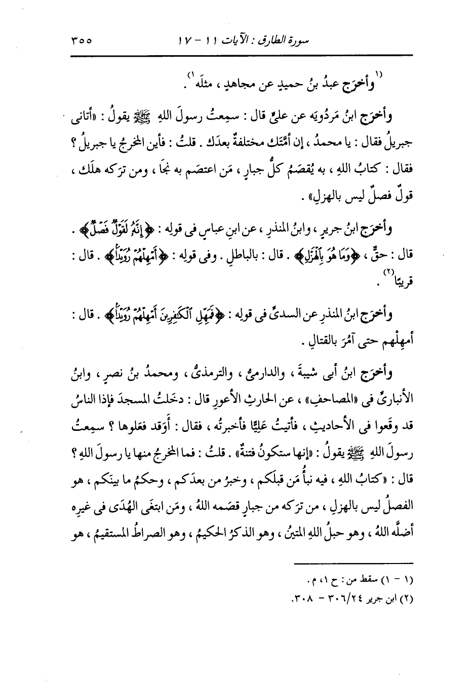 وأخرج ابن أبي شيبة والدارمي والترمذي ومحمد بن نصر ، وَابن الأنباري في المصاحف عن الحارث الأعور قال : دخلت المسجد فإذا الناس قد وقعوا في الأحاديث فأتيت عليا فأخبرته فقال : أوقد فعلوها سمعت رسول الله صلى الله عليه وسلم يقول : إنها ستكون فتنة قلت : فما المخرج منها يا رسول الله قال : كتاب الله فيه نبأ من قبلكم وخبر من بعدكم وحكم ما بينكم هو الفصل ليس بالهزل من تركه من جبار قصمه الله ومن ابتغى الهدى في غيره أضله الله وهو حبل الله المتين وهو الذكر الحكيم وهو الصراط المستقيم هو