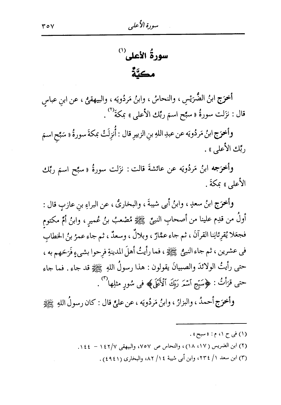 أَخْرَج ابن الضريس والنحاس ، وَابن مردويه والبيهقي عن ابن عباس قال : نزلت سورة {سبح} بمكة.