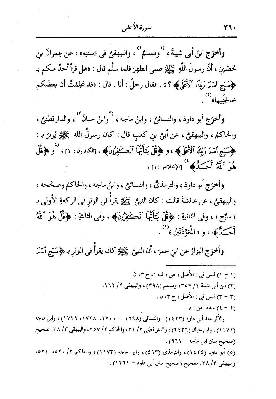 وأخرج أبو داود والنسائي ، وَابن ماجة ، وَابن حبان والدارقطني والحاكم والبيهقي عن أبي بن كعب قال : كان رسول الله صلى الله عليه وسلم يوتر ب {سبح اسم ربك الأعلى} و(قل يا أيها الكافرون) (سورة الكافرون الآية 1).