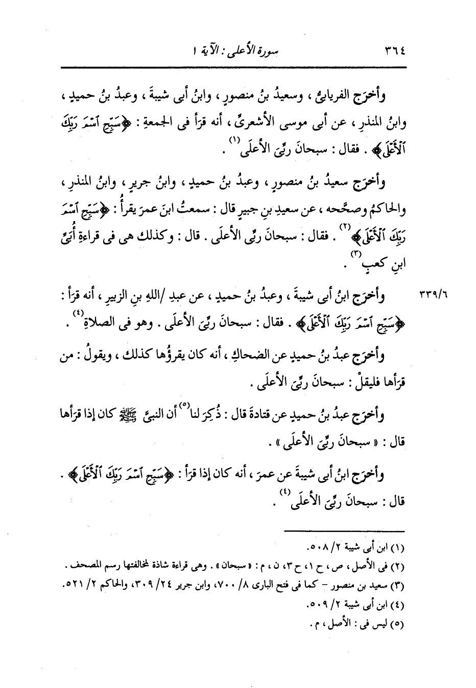وأخرج سعيد بن منصور ، وعَبد بن حُمَيد ، وَابن جَرِير ، وَابن المنذر والحاكم وصححه عن سعيد بن جبير قال : سمعت ابن عمر يقرأ / {سبحان اسم ربك الأعلى > / فقال : سبحان ربي الأعلى ، قال : كذلك هي قراءة أبي بن كعب.