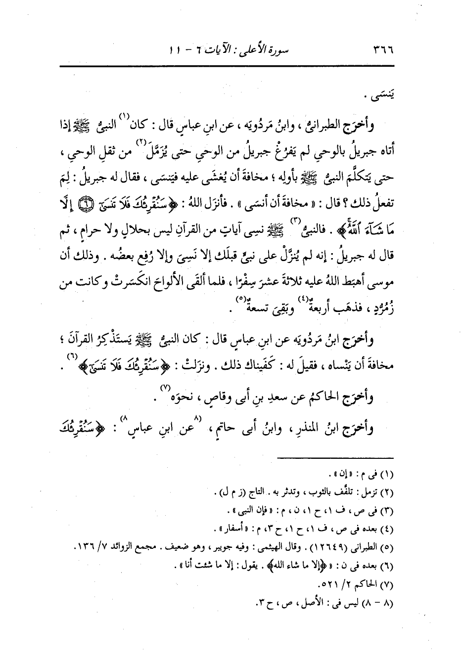 وأخرج الطبراني ، وَابن مردويه عن ابن عباس قال : إن النَّبِيّ صلى الله عليه وسلم إذا أتاه جبريل بالوحي لم يفرغ جبريل من الوحي حتى يزمل من ثقل الوحي حتى يتكلم النَّبِيّ صلى الله عليه وسلم بأوله مخافة أن يغشى عليه فينسى فقال له جبريل : لم تفعل ذلك قال مخافة أن أنسى ، فأنزل الله {سنقرئك فلا تنسى إلا ما شاء الله} فإن النَّبِيّ صلى الله عليه وسلم نسي آيات من القرآن ليس بحلال ولا حرام ثم قال له جبريل : إنه لم ينزل على نبي قبلك إلا نسي وإلا رفع بعضه وذلك أن موسى أهبط الله عليه ثلاثة عشر سفرا فلما ألقى الألواح انكسرت وكانت من زمرد فذهب أربعة أسفار وبقي تسعة.