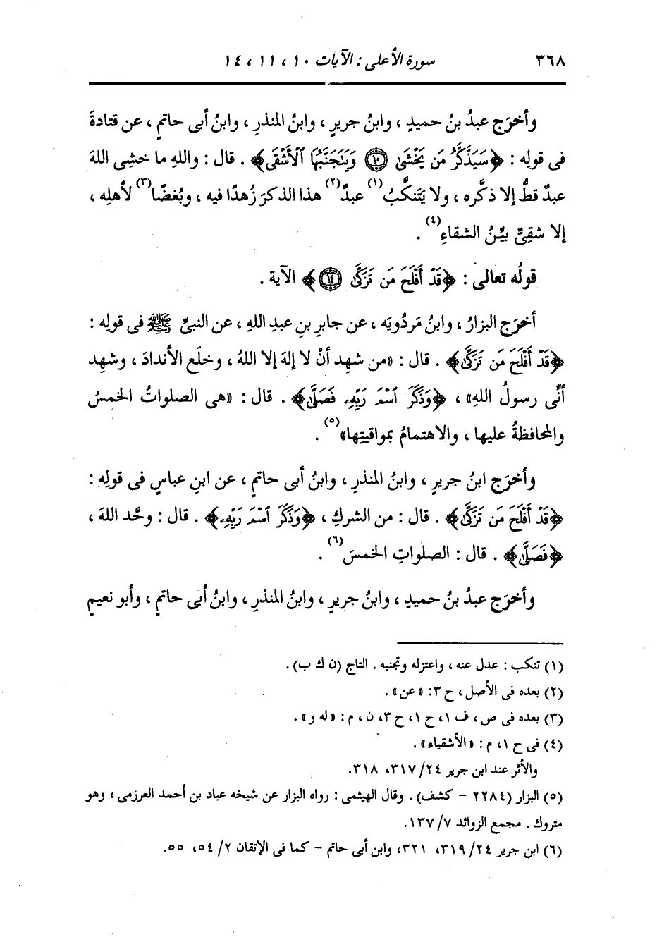 أخرج البزار ، وَابن مردويه ، عَن جَابر بن عبد الله عن النَّبِيّ صلى الله عليه وسلم : في قوله : {قد أفلح من تزكى} قال : من شهد أن لا إله إلا الله وخلع الأنداد وشهد أني رسول الله {وذكر اسم ربه فصلى} قال : هي الصلوات الخمس والمحافظة عليها والاهتمام بمواقيتها.