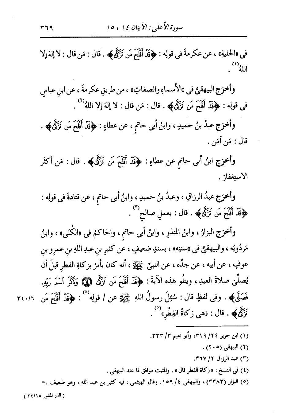 وأخرج البيهقي في الأسماء والصفات من طريق عكرمة عن ابن عباس رضي الله عنهما في قوله : {قد أفلح من تزكى} قال : من قال لا إله إلا الله.
