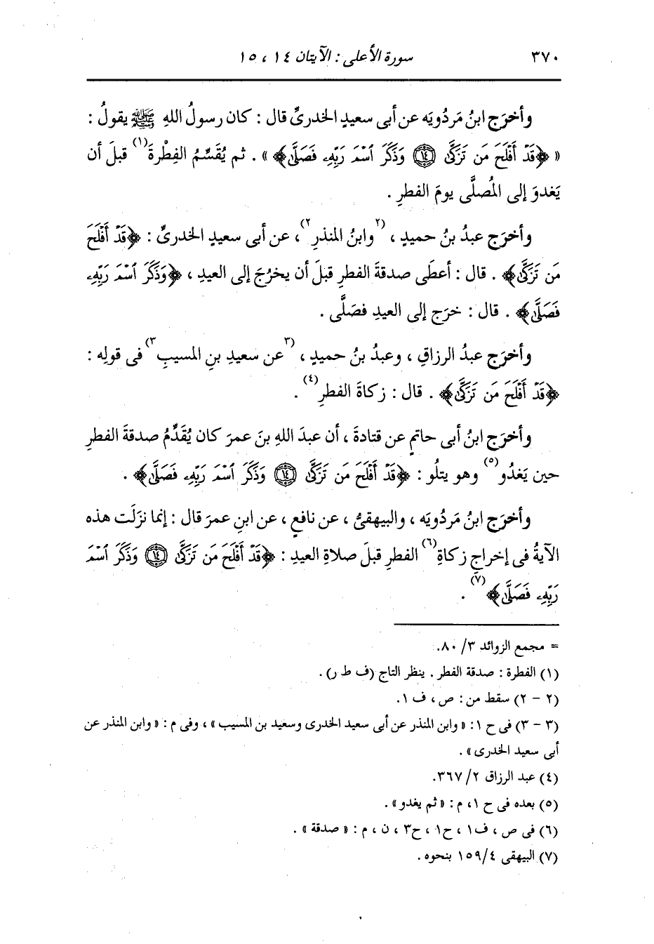 وأخرج عَبد بن حُمَيد ، وَابن المنذر عن أبي سعيد الخدري رضي الله عنه {قد أفلح من تزكى} قال : أعطى صدقة الفطر قبل أن يخرج إلى العيد {وذكر اسم ربه فصلى} قال : خرج إلى العيد فصلى.