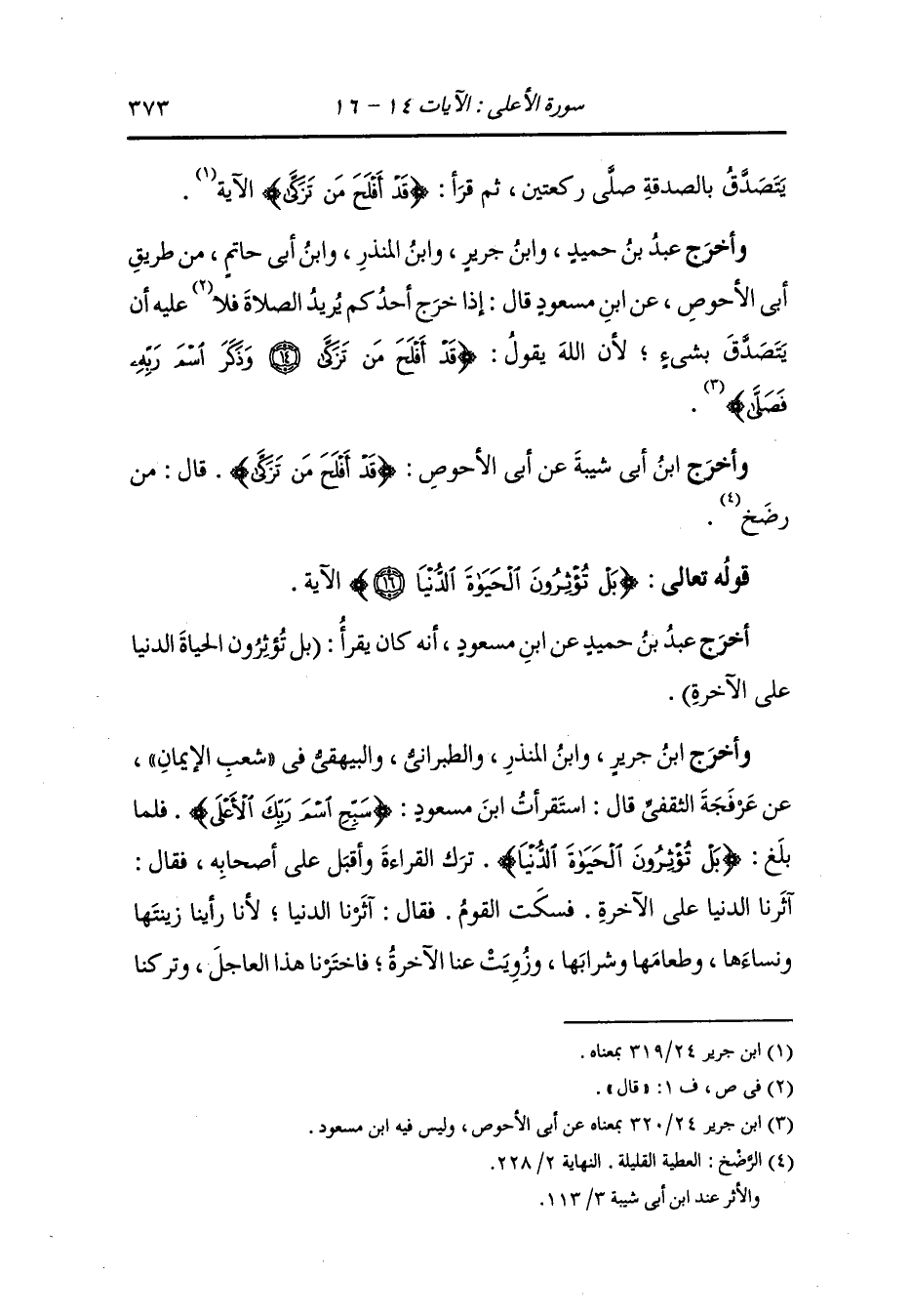 وأخرج زيد بن حميد ، وَابن جَرِير ، وَابن المنذر ، وَابن أبي حاتم من طريق أبي الأحوص عن ابن مسعود رضي الله عنه قال : إذا خرج أحدكم يريد الصلاة فلا عليه أن يتصدق بشيء لأن الله يقول : {قد أفلح من تزكى وذكر اسم ربه فصلى}.