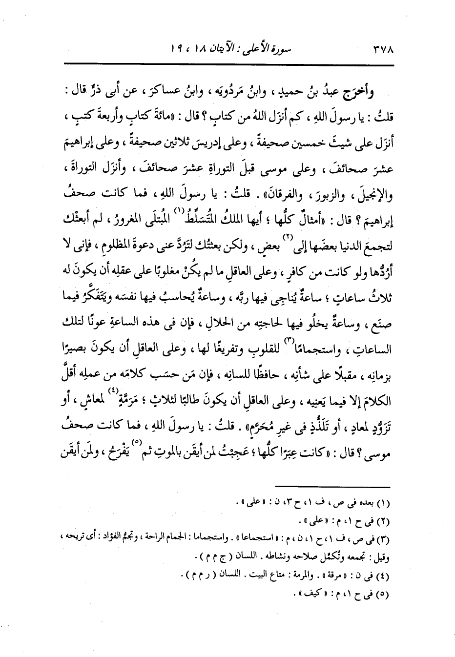 وأخرج عَبد بن حُمَيد ، وَابن مردويه ، وَابن عساكر عن أبي ذر رضي الله عنه قال : قلت يا رسول الله كم أنزل الله من كتاب قال مائة كتاب وأربعة كتب أنزل على شيث خمسين صحيفة وعلى إدريس ثلاثين صحيفة وعلى إبراهيم عشر صحائف وعلى موسى قبل التوراة عشر صحائف وأنزل التوراة والإنجيل والزبور والفرقان ، قلت يا رسول الله : فما كانت صحف إبراهيم قال : أمثال كلها أيها الملك المتسلط المبتلي المغرور لم أبعثك لتجمع الدنيا بعضها على بعض ولكن بعثتك لترد عني دعوة المظلوم فإني لا أردها لتجمع الدنيا بعضها على بعض ولكن بعثتك لترد عني دعوة المظلوم فإني لا أردها ولو كانت من كافر وعلى العاقل ما لم يكن مغلوبا على عقله أن يكون له ثلاث ساعات ساعة يناجي فيها ربه وساعة يحاسب فيها نفسه ويتفكر فيما صنع وساعة يخلو فيها لحاجته من الحلال فإن في هذه الساعة عونا لتلك الساعات واستجماعا للقلوب وتفريغا لها وعلى العاقل أن يكون بصيرا بزمانه مقبلا على شأنه حافظا للسانه فإن من حسب كلامه من عمله أقل الكلام إلا فيما يعنيه وعلى العاقل أن يكون طالبا لثلاث مرمة لمعاش أو تزود لمعاد أو تلذذ في غير محرم ، قلت يا رسول الله : فما كانت صحف موسى قال : كانت عبرا كلها عجبت لمن أيقن بالموت كيف يفرح ولمن أيقن