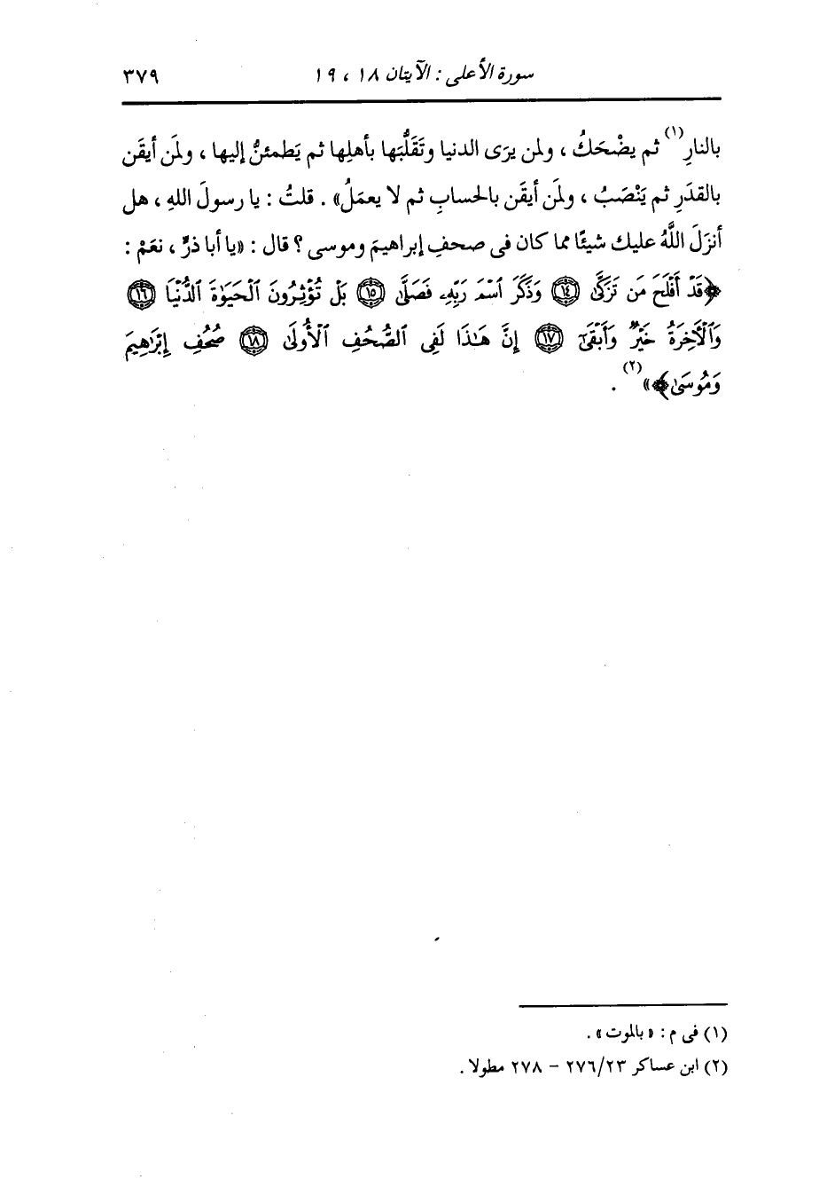 بالموت ثم يضحك ولمن يرى الدنيا وتقلبها بأهلها ثم يطمئن إليها ولمن أيقن بالقدر ثم ينصب ولمن أيقن بالحساب ثم لا يعمل ، قلت يا رسول الله : هل أنزل عليك شيء مما كان في صحف إبراهيم وموسى قال : يا أبا ذر نعم {قد أفلح من تزكى وذكر اسم ربه فصلى بل تؤثرون الحياة الدنيا والآخرة خير وأبقى إن هذا لفي الصحف الأولى صحف إبراهيم وموسى}.