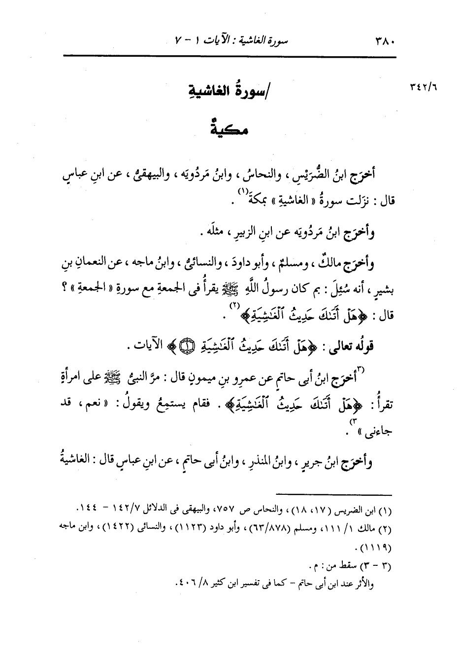 أَخْرَج ابن الضريس والنحاس ، وَابن مردويه والبيهقي عن ابن عباس رضي الله عنهما قال : نزلت سورة الغاشية بمكة.