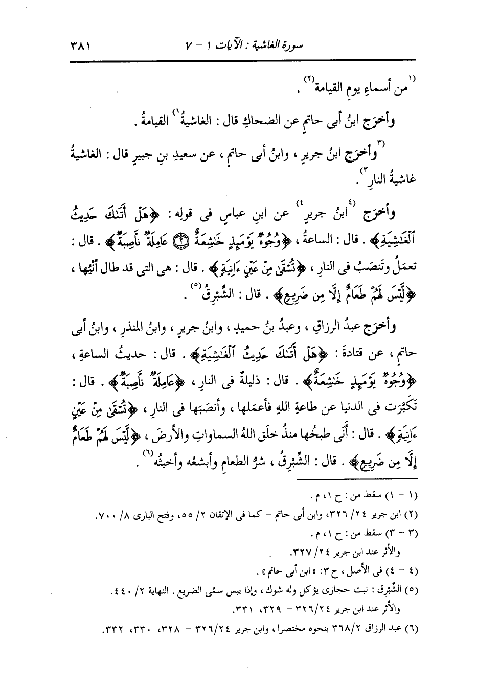 وأخرج ابن جرير عن ابن عباس في {هل أتاك حديث الغاشية} قال : الساعة {وجوه يومئذ خاشعة عاملة ناصبة} قال : تعمل وتنصب في النار {تسقى من عين آنية} قال : هي التي قد طال أنيها {ليس لهم طعام إلا من ضريع} قال : الشبرق.