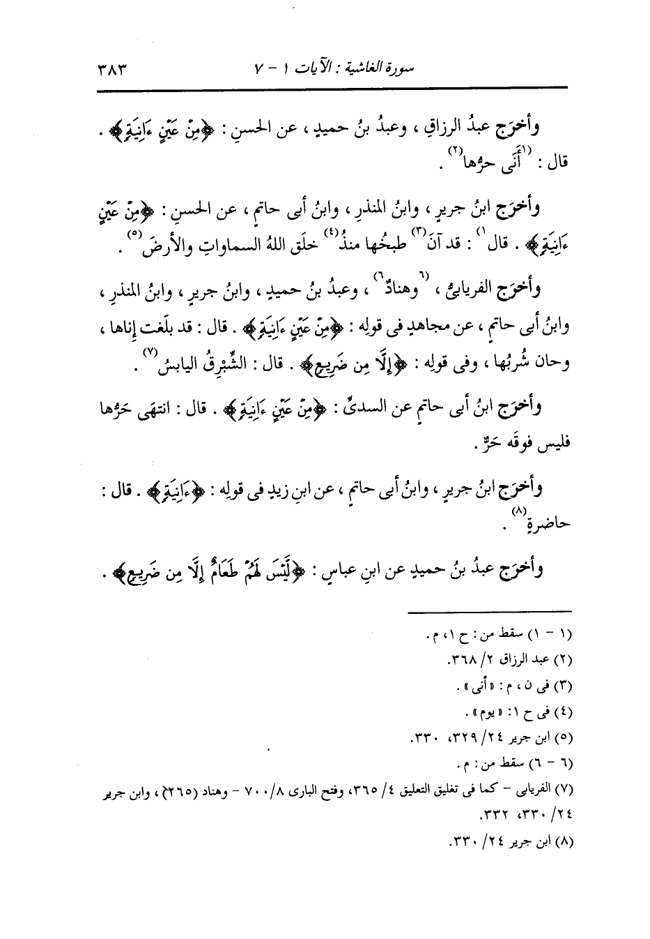 وَأخرَج الفريابي ، وعَبد بن حُمَيد ، وَابن جَرِير ، وَابن المنذر ، وَابن أبي حاتم عن مجاهد رضي الله عنه في قوله : {من عين آنية} قال : قد بلغت إناها وحان شربها وفي قوله : {إلا من ضريع} قال : الشبرق اليابس.