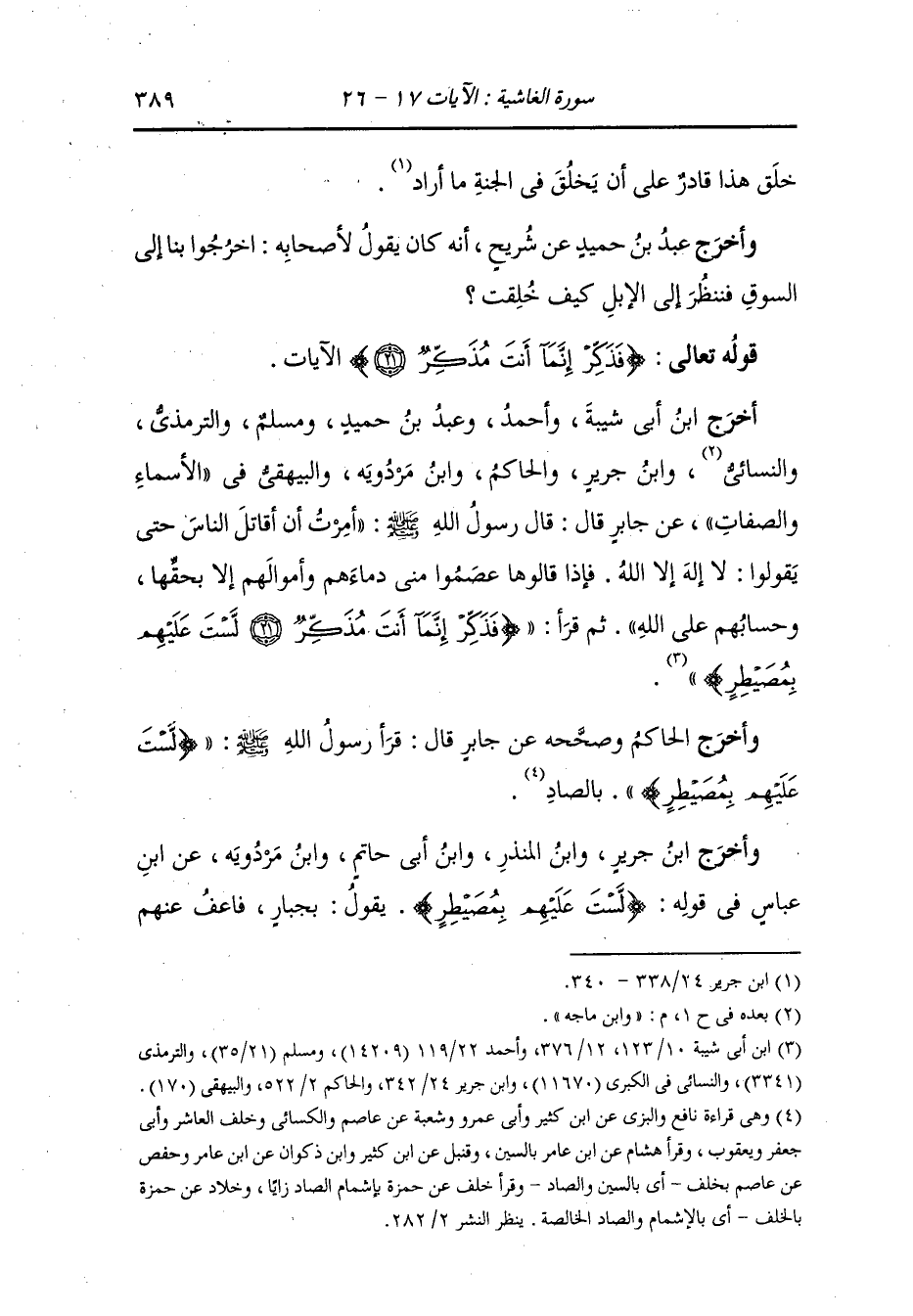 أخرج ابن أبي شيبة وأحمد ، وعَبد بن حُمَيد ومسلم والترمذي والنسائي ، وَابن ماجة ، وَابن جَرِير والحاكم ، وَابن مردويه والبيهقي في الأسماء والصفات ، عَن جَابر قال : قال رسول الله صلى الله عليه وسلم : أمرت أن أقاتل الناس حتى يقولوا لا إله إلا الله فإذا قالوها عصموا مني دمائهم وأموالهم إلا بحقها وحسابهم على الله ثم قرأ {فذكر إنما أنت مذكر لست عليهم بمصيطر}.