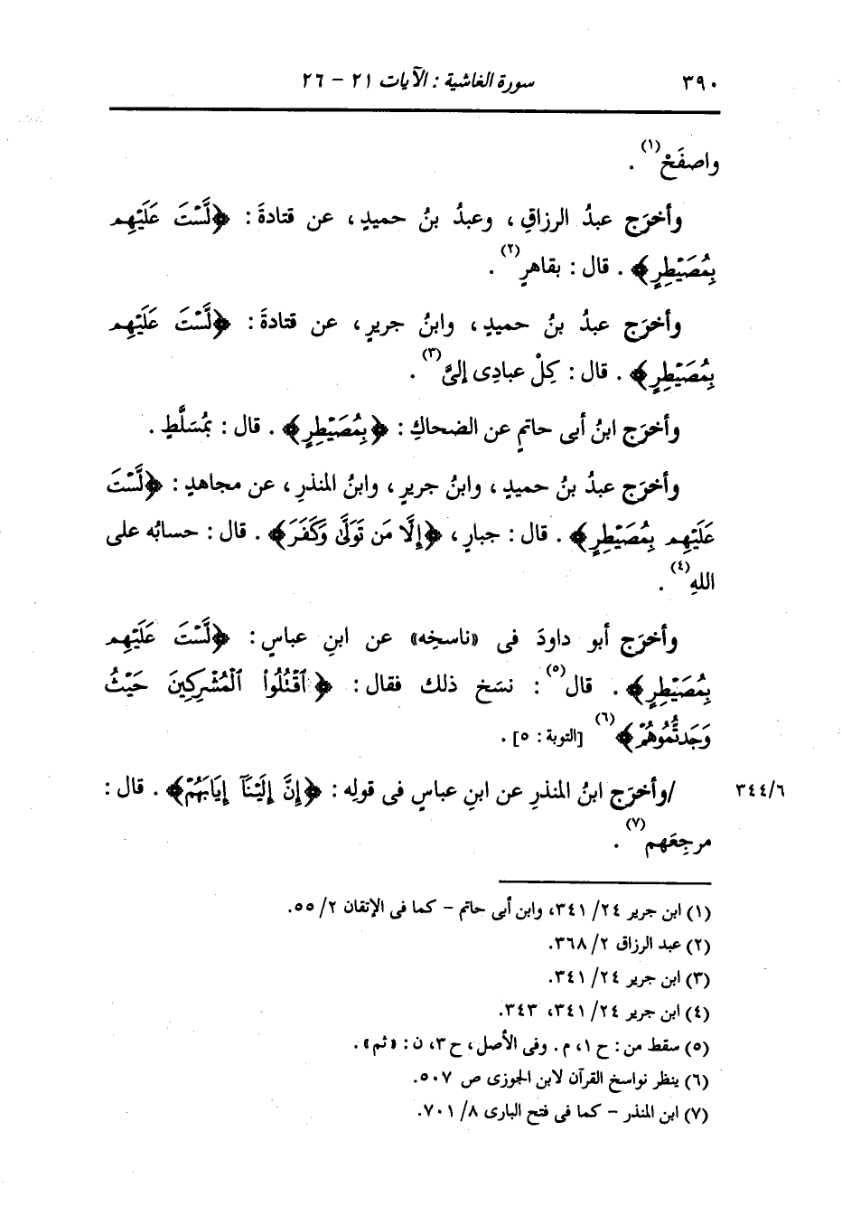 وأخرج أبو داود في ناسخه عن ابن عباس {لست عليهم بمصيطر} نسخ ذلك فقال : (فاقتلوا المشركين حيث وجدتموهم) (سورة التوبة الآية 5).