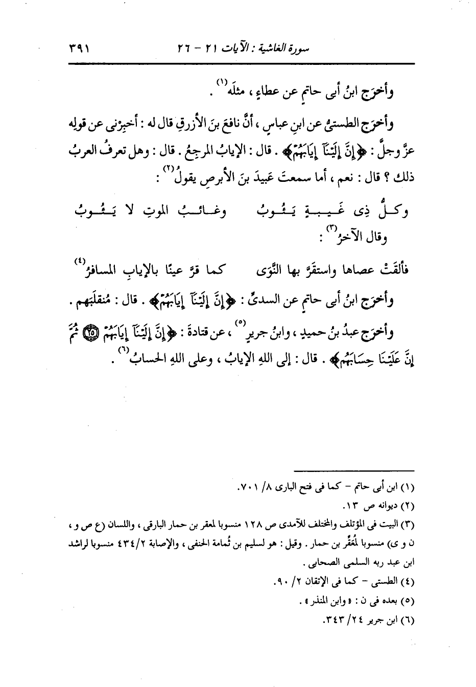 وأخرج الطستي عن ابن عباس أن نافع بن الأزرق قال له : أخبرني عن قوله : عز وجل {إن إلينا إيابهم} قال : الإياب المرجع ، قال : وهل تعرف العرب ذلك قال : نعم أماسمعت عبيد بن الأبرص يقول :