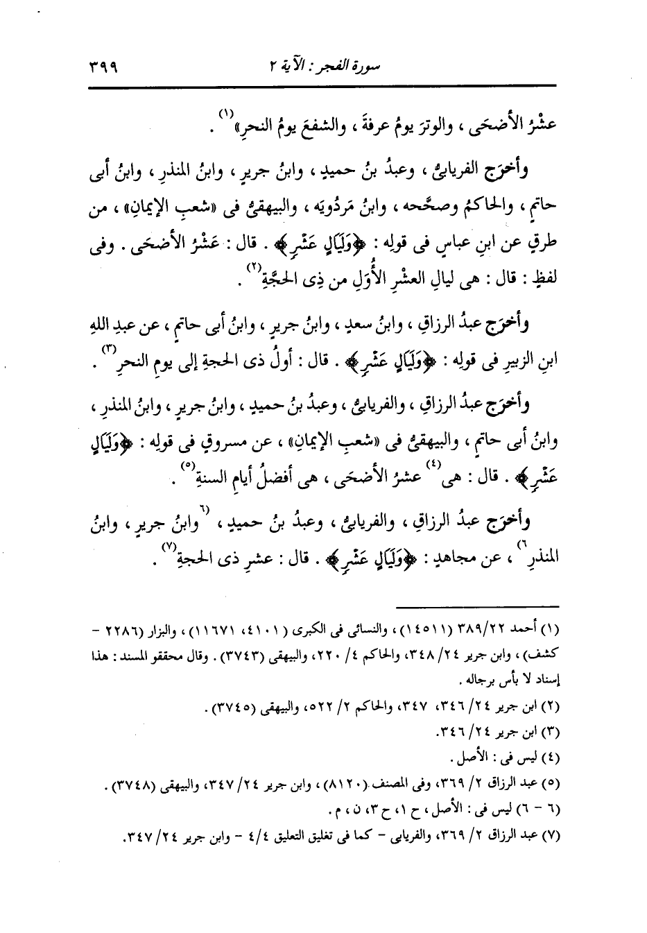 وأخرج الفريابي ، وعَبد بن حُمَيد ، وَابن جَرِير ، وَابن المنذر ، وَابن أبي حاتم والحاكم وصححه ، وَابن مردويه والبيهقي في الشعب من طرق عن ابن عباس في قوله : {وليال عشر} قال : عشرة الأضحى وفي لفظ قال : هي ليال العشر الأول من ذي الحجة.