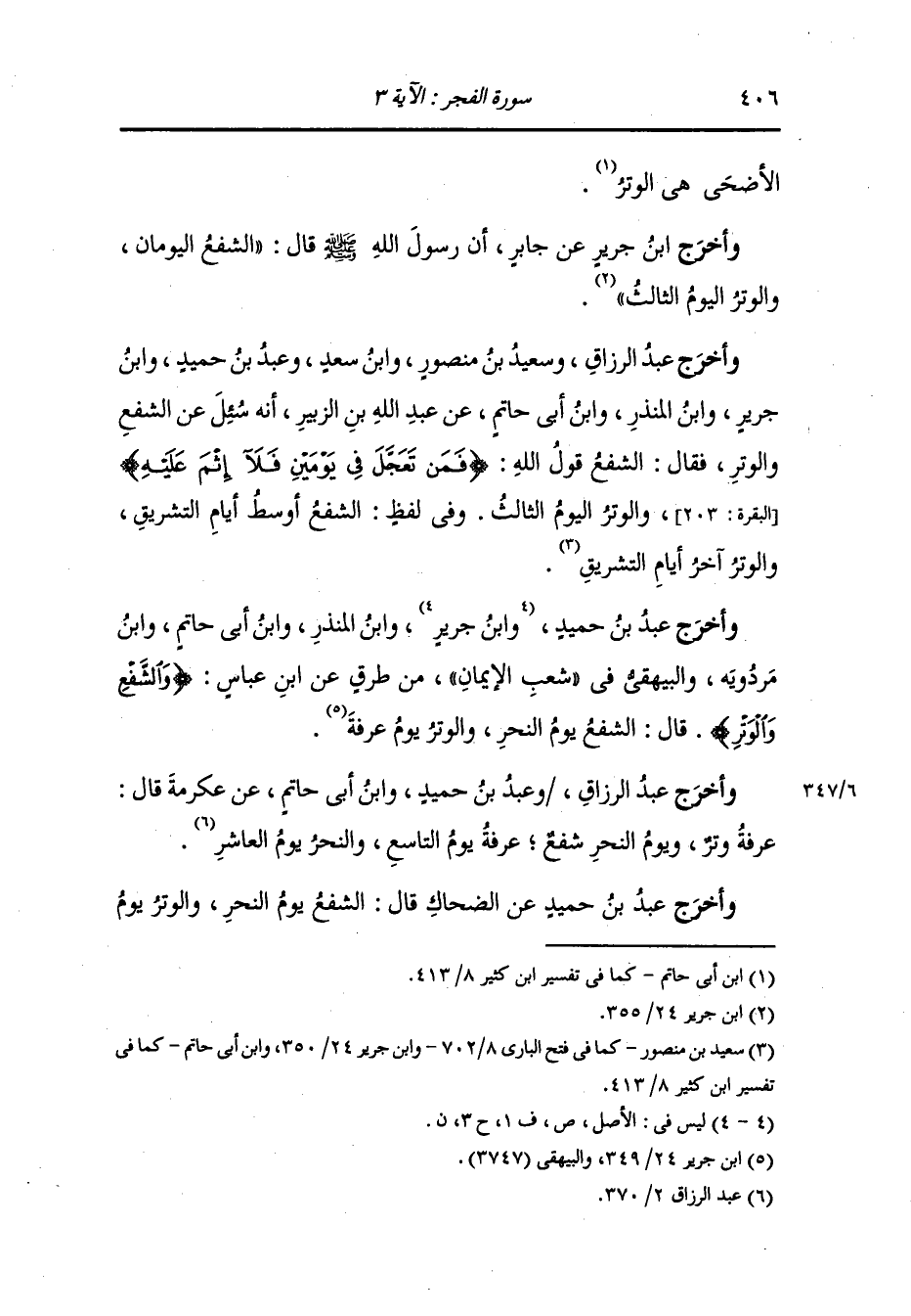 وأخرج عبد الرزاق ، وعَبد بن حُمَيد ، وَابن أبي حاتم عن عكرمة قال : عرفة وتر ويوم النحر شفع عرفة يوم التاسع والنحر يوم العاشر.