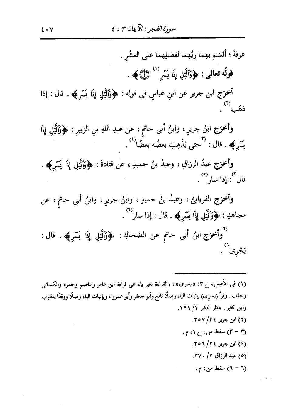 وأخرج ابن جرير ، وَابن أبي حاتم عن عبد الله بن الزبير {والليل إذا يسر} قال : إذا سار.