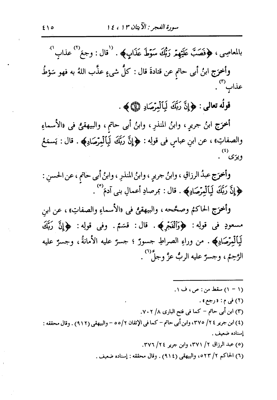 أخرج ابن جرير ، وَابن المنذر ، وَابن أبي حاتم والبيهقي في الأسماء والصفات عن ابن عباس قوله : {إن ربك لبالمرصاد} قال : يسمع ويرى.