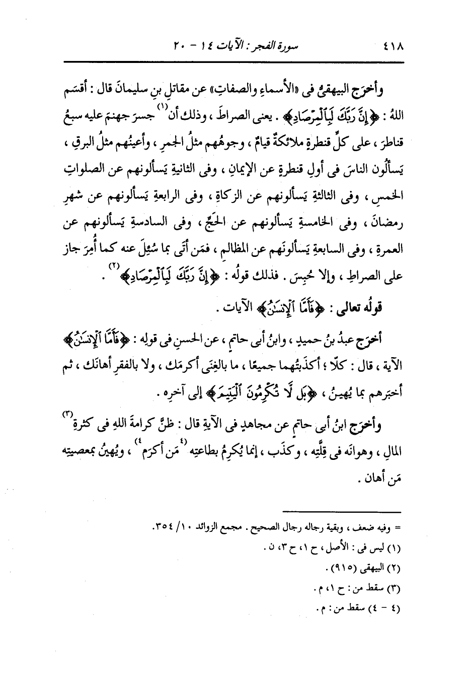 وأخرج البيهقي في الأسماء والصفات عن مقاتل بن سليمان قال : أقسم الله {إن ربك لبالمرصاد} يعني الصراط وذلك إن جسر جهنم عليه سبع قناطر على كل قنطرة ملائكة قيام وجوههم مثل الجمر وأعينهم مثل البرق يسألون الناس في أول قنطرة عن الإيمان وفي الثانية يسألونهم عن الصلوات الخمس وفي الثالثة يسألونهم عن الزكاة وفي الرابعة يسألونهم عن شهر رمضان وفي الخامسة يسألونهم على الحج وفي السادسة يسألونهم عن العمرة وفي السابعة يسألونهم عن المظالم فمن أتى بما سئل عنه كما أمر جاز على الصراط وإلا حبس فذلك قوله : {إن ربك لبالمرصاد}.
