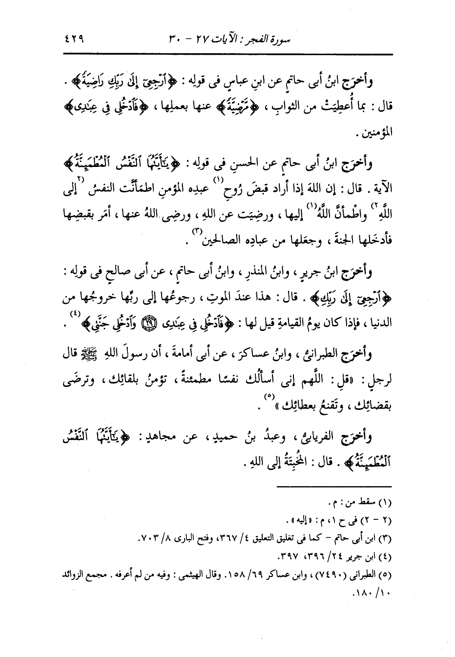 وأخرج الفريابي ، وعَبد بن حُمَيد عن مجاهد رضي الله عنه {يا أيتها النفس المطمئنة} قال : المخبتة إلى الله.