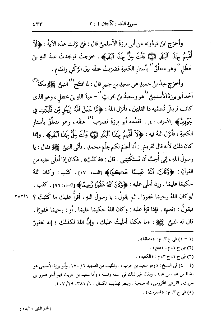 وأخرج عَبد بن حُمَيد عن سعيد بن جبير رضي الله عنه قال : لما فتح النَّبِيّ صلى الله عليه وسلم الكعبة أخذ أبو برزة الأسلمي وهو سعيد بن حرب عبد الله بن خطل وهو الذي كانت قريش تسميه ذا القلبين فأنزل الله (ما جعل الله لرجل من قلبين في جوفه) (سورة الأحزاب الآية 4) فقدمه أبو برزة فضربت عنقه وهو متعلق بأستار الكعبة فأنزل الله فيها {لا أقسم بهذا البلد وأنت حل بهذا البلد} وإنما كان ذلك لأنه قال لقريش : أنا أعلم لكم علم محمد فأتى النَّبِيّ صلى الله عليه وسلم فقال : يا رسول الله إني أحب أن تستكتبني قال : فاكتب فكان إذا أملى عليه من القرآن وكان الله عليما حكيما كتب وكان الله حكيما عليما وإذا أملى عليه وكان الله غفورا رحيما كتب وكان الله رحيما غفورا ، ثم يقول : يا رسول الله اقرأ عليك ما كتبت ، فيقول : نعم فإذا قرأ عليه وكان الله عليما حكيما أو رحيما غفورا قال له النَّبِيّ صلى الله عليه وسلم : ما هكذا أمليت عليك وإن الله لكذلك إنه لغفور