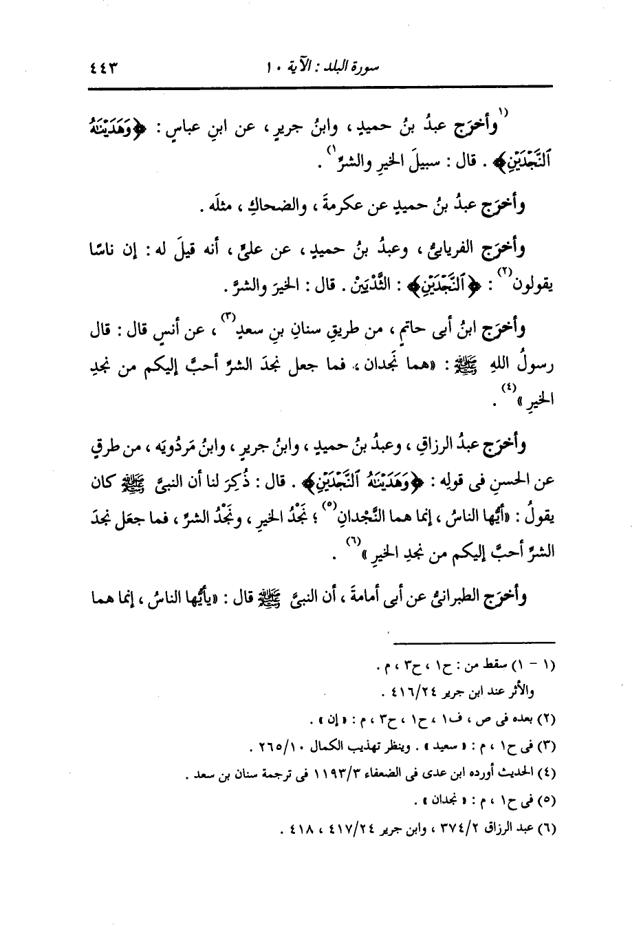 وأخرج عَبد بن حُمَيد ، وَابن جَرِير عن ابن عباس : (وهديناه النجدين) قال: سبيل الخير والشر..