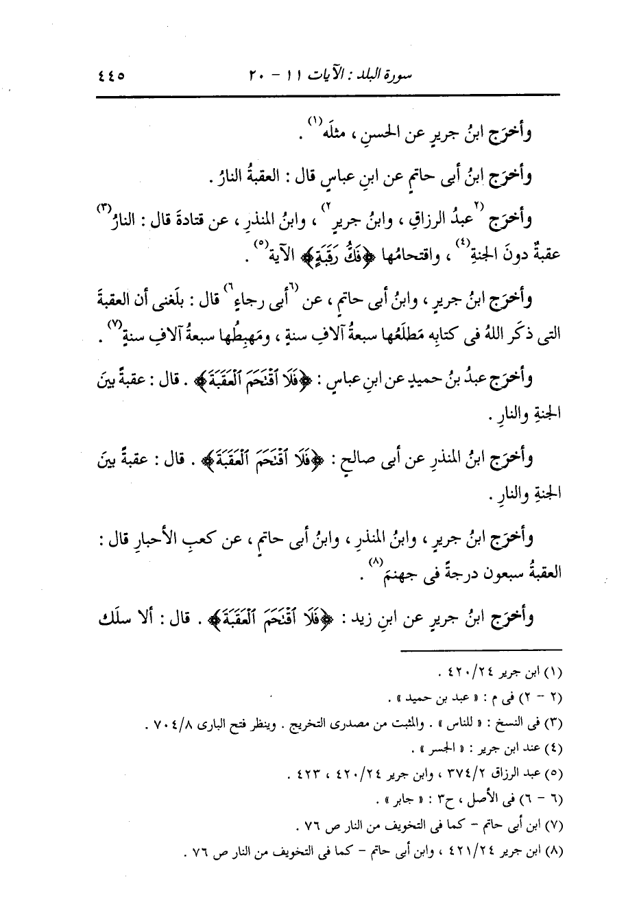 وأخرج عَبد بن حُمَيد عن ابن عباس رضي الله عنهما {فلا اقتحم العقبة} قال : عقبة بين الجنة والنار.