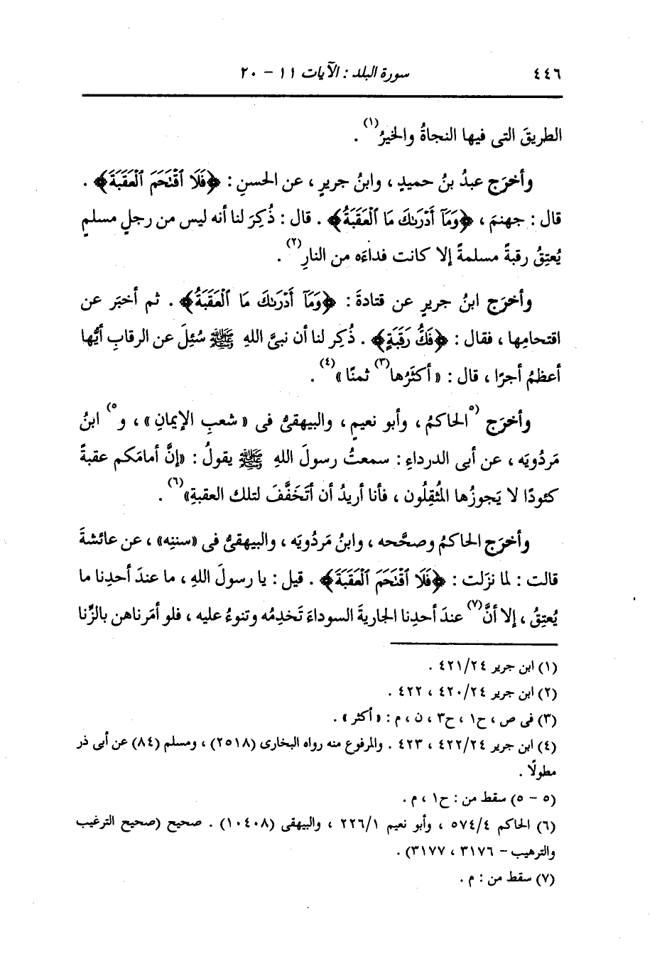 وأخرج عَبد بن حُمَيد ، وَابن جَرِير عن الحسن {فلا اقتحم العقبة} قال : جهنم وما أدراك ما العقبة قال : ذكر لنا أنه ليس من رجل مسلم يعتق رقبة مسلمة إلا كانت فداءه من النار.