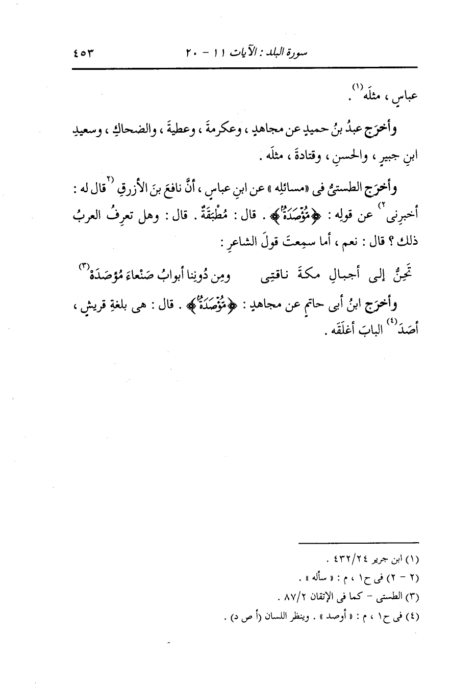 وأخرج الطستي في مسائله عن ابن عباس أن نافع بن الأزرق سأله عن قوله {مؤصدة} قال : مطبقة ، قال : وهل تعرف العرب ذلك قال : نعم أما سمعت قول الشاعر : تحن إلى أجبال مكة ناقتي * ومن دوننا أبواب صنعا مؤصدة.