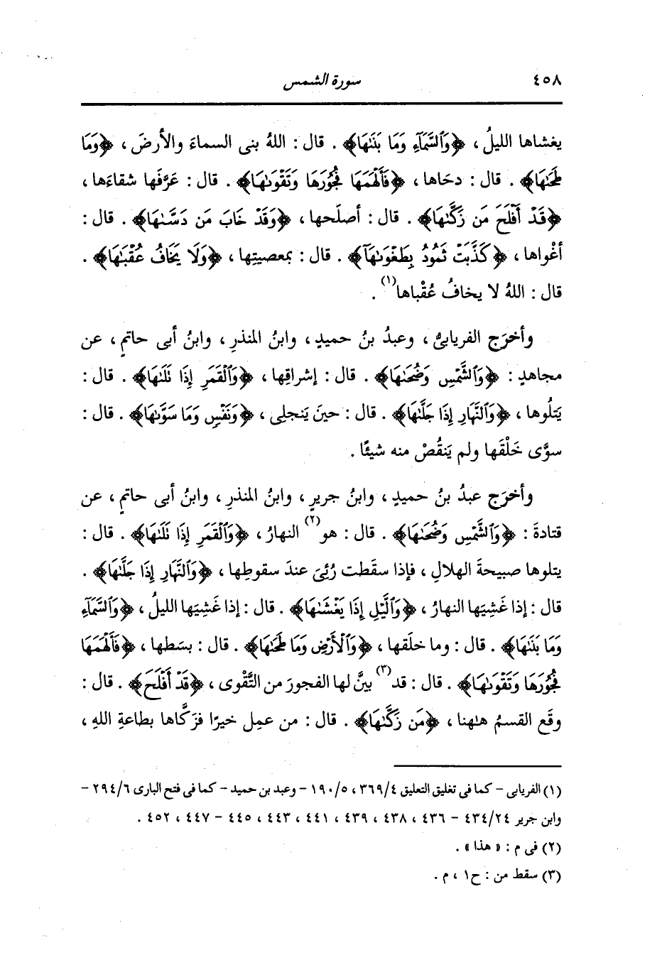 وأخرج الفريابي ، وعَبد بن حُمَيد ، وَابن المنذر ، وَابن أبي حاتم عن مجاهد {والشمس وضحاها} قال : إشراقها {والقمر إذا تلاها} قال : يتلوها {والنهار إذا جلاها} قال : حين ينجلي {ونفس وما سواها} قال : سوى خلقها ولم ينقص منه شيئا.
